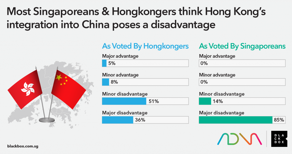 In an October 2022 Blackbox-ADNA survey, 99% of polled Singaporeans felt that Hong Kong’s integration into China posed major disadvantages to the city at present. On the other hand, 51% of polled Hongkongers saw minor disadvantages at the very least while 36% felt that the integration poses major disadvantages. This is unfortunate as Hong Kong remains one of the easiest places to do business, especially for companies looking to eventually enter the mainland Chinese market.