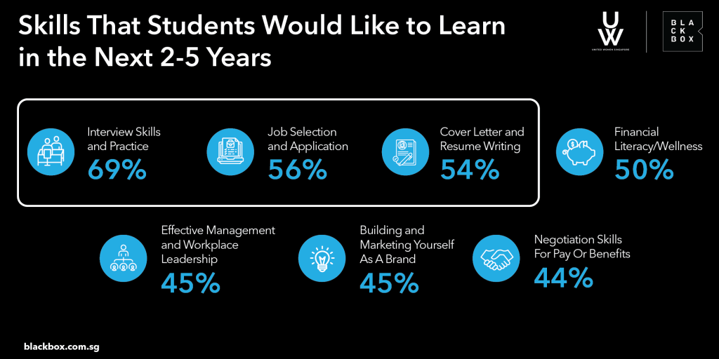 When asked about the skillset that they’d like to build on in the next two to five years, 69% selected ‘interview skills and practice’, 56% opted for ‘job selection and application’, and 54% highlighted the need to be trained in ‘cover letter and resume writing’.
