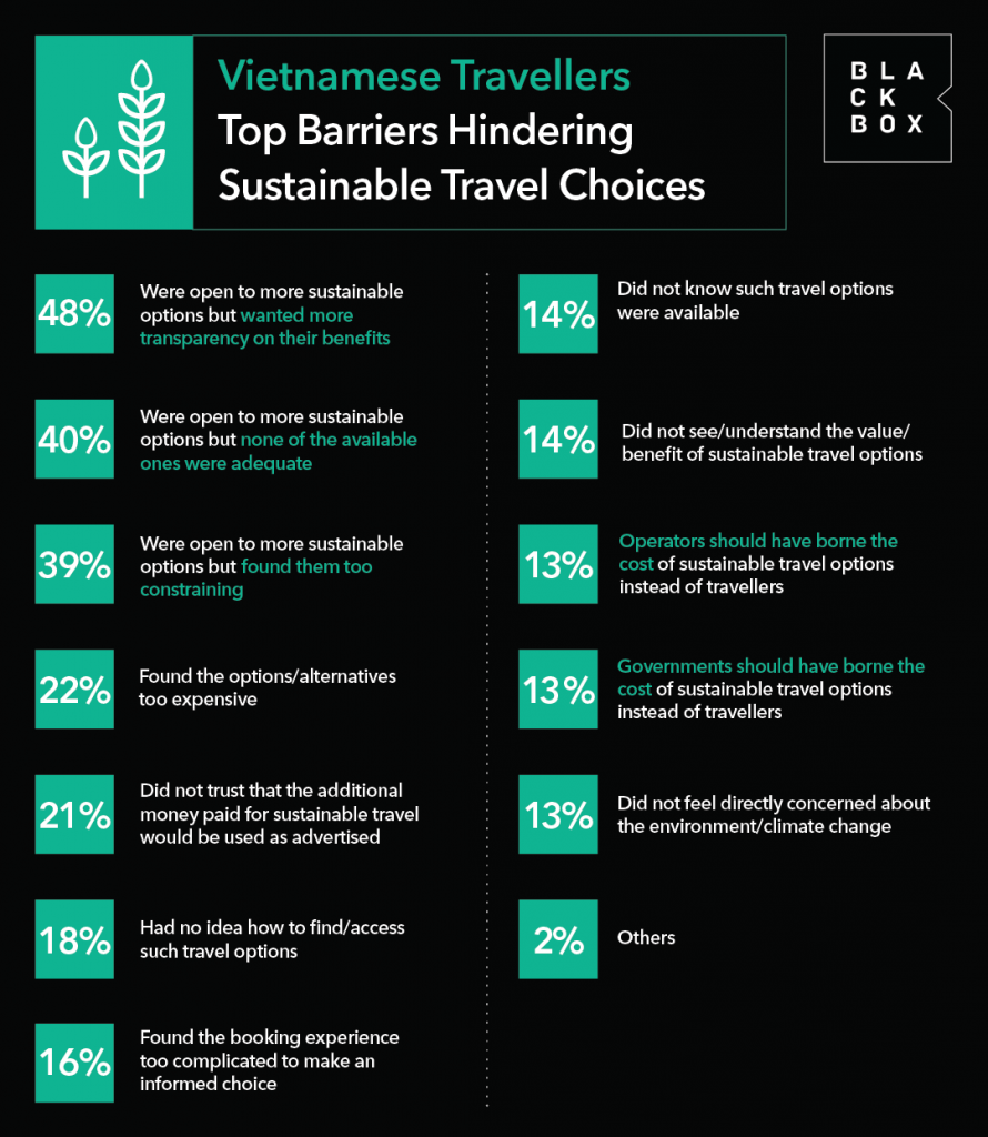 Transparency, adequacy, and sufficiency of sustainable options are the key barriers. Cost, for Vietnamese travellers, doesn’t appear to be a major factor and the previously highlighted finding of high self-responsibility is evident in the fact that only a small percentage of citizens feel that the government should bear the cost of sustainable travel instead of themselves. The other options occupying the lower ranks also suggest that Vietnamese are among the more aware travellers when it comes to choosing sustainable options.
